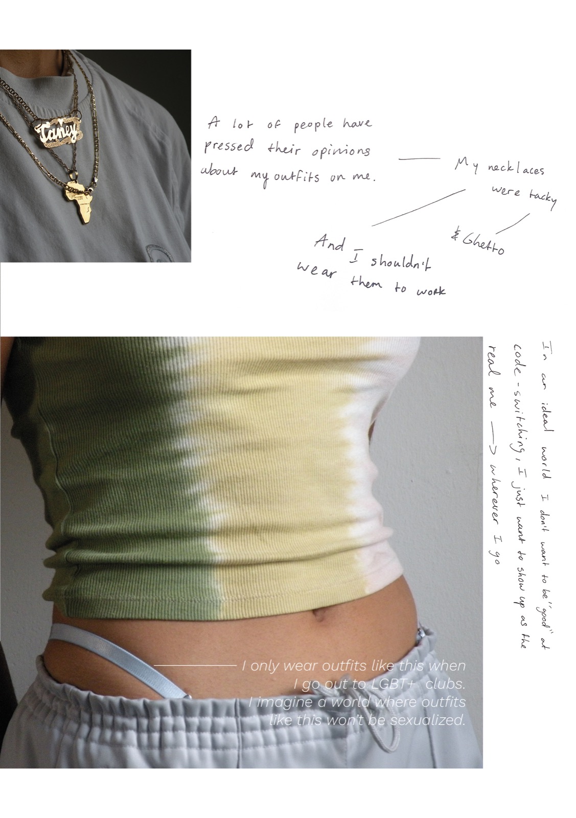 “As a diverse group with very different people we found out that we all codeswitch in different ways. Still, we have one thing in common. The way we dress changes when we code switch. Thus we decided to focus on this fashion/clothing aspect.”